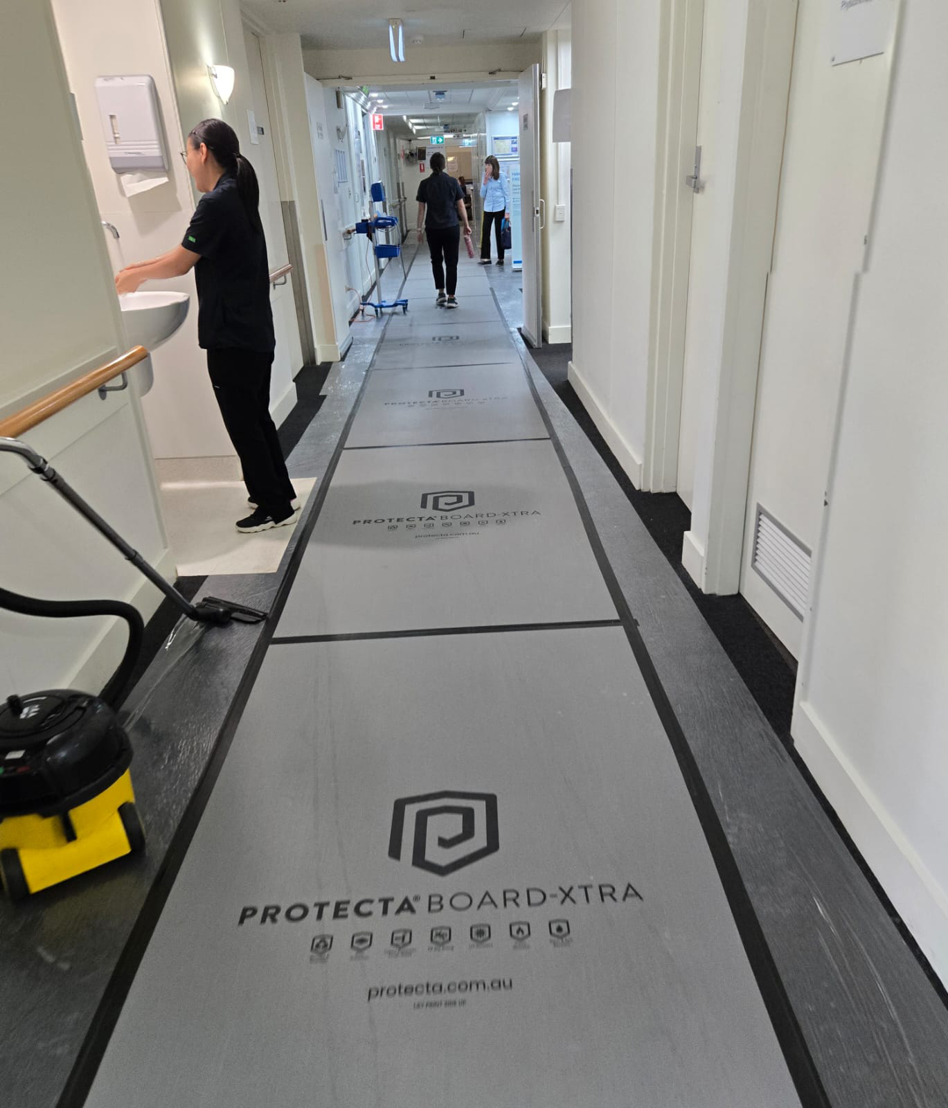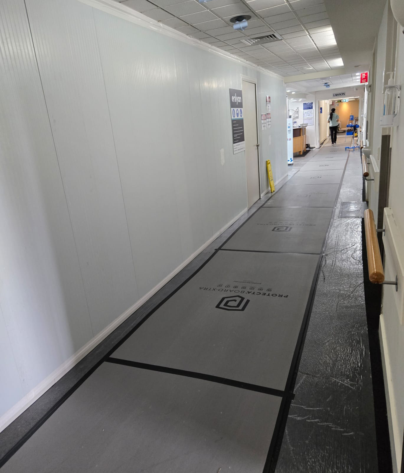 The shared walkway (consisting of hard flooring and carpet) from the hospital entrance to the work zone needed a non-slip, durable floor protection solution, capable of withstanding frequent foot traffic, heavy equipment movement and regular cleaning with a floor scrubber.