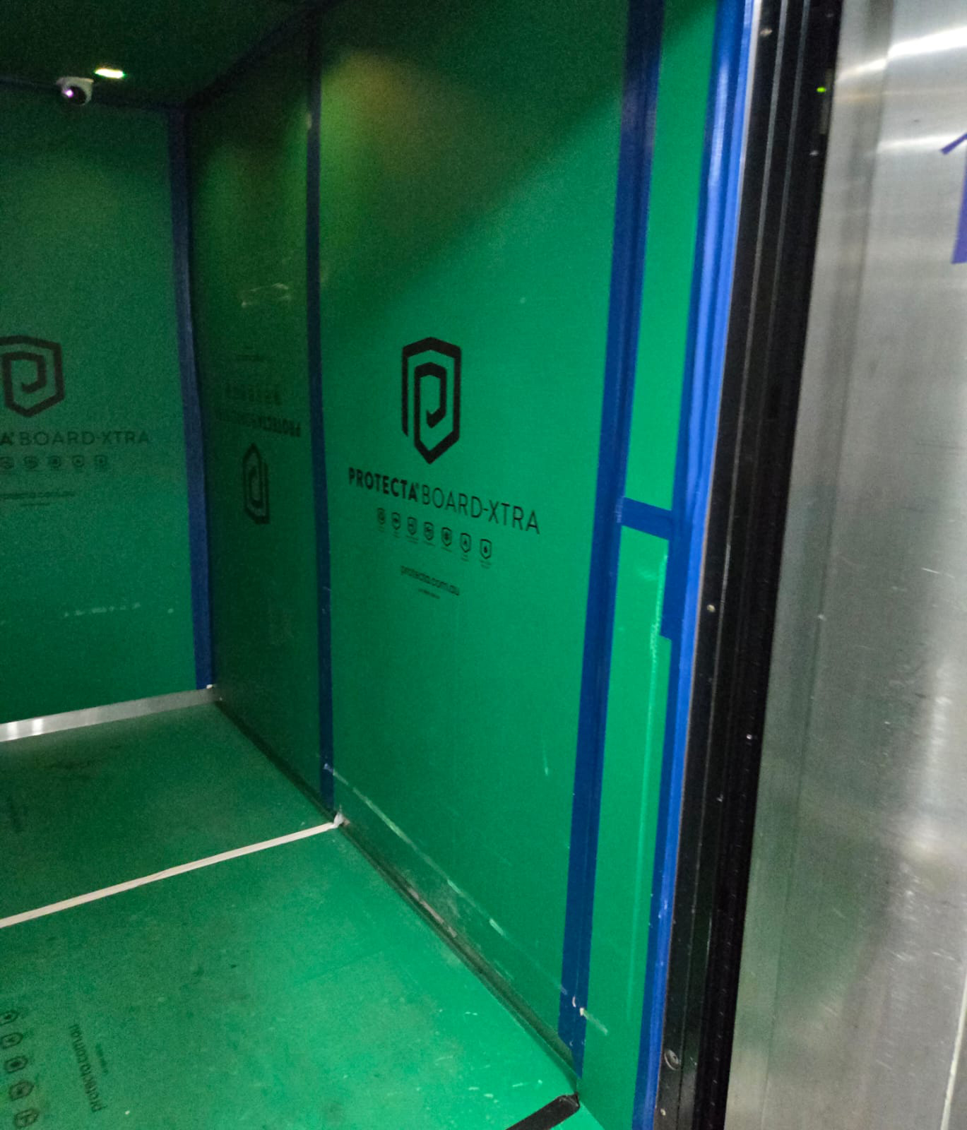 In the goods lift, Protecta Board XTRA 5mm was applied to the interior walls to absorb impact from materials in transit, preserving the condition of the lift throughout the project.